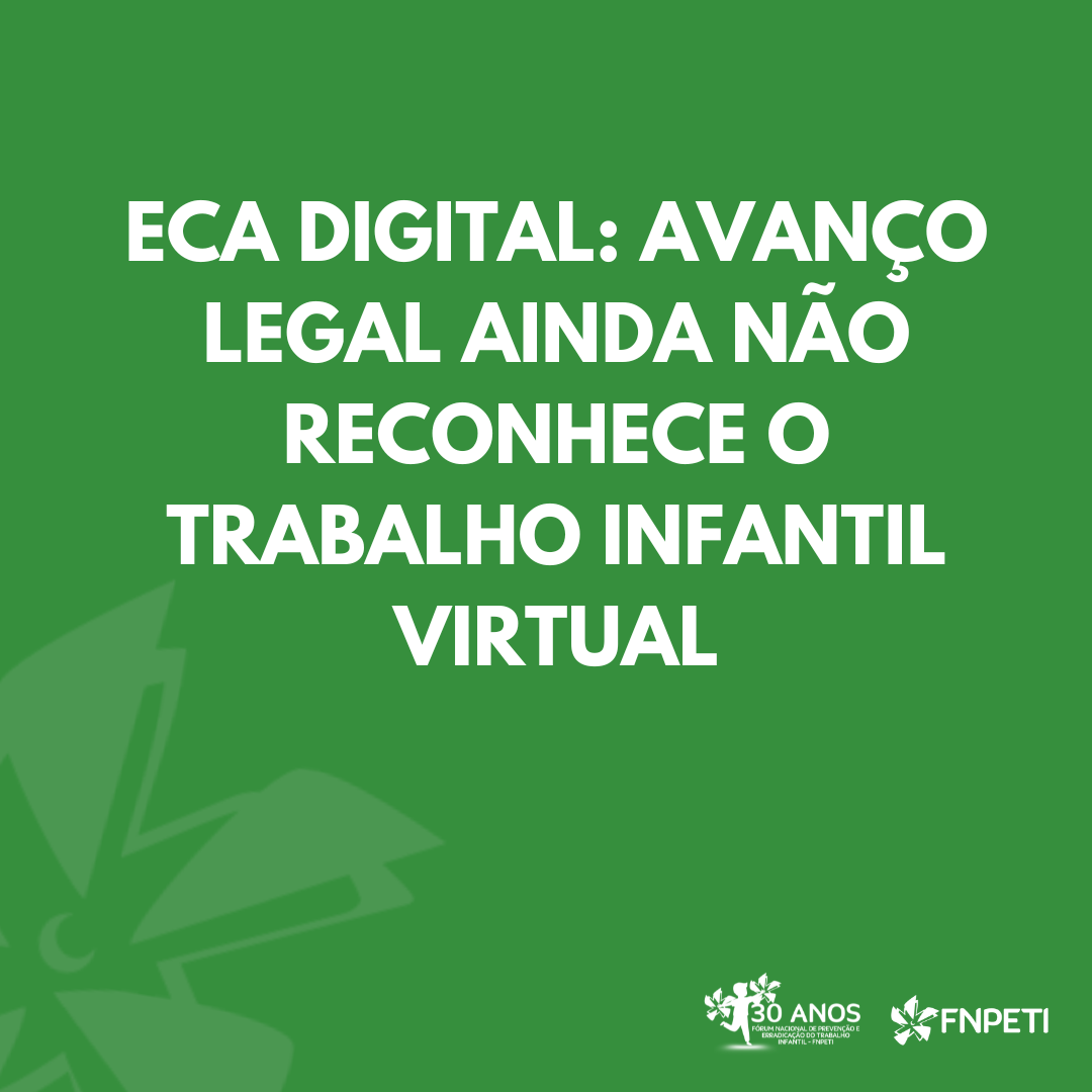 Essa ausência de reconhecimento explícito no ECA Digital levanta o alerta de organizações como o Fórum Nacional de Prevenção e Erradicação do Trabalho Infantil e Proteção de Adolescentes no Trabalho (FNPETI), que defende a necessidade de ampliar e aprofundar o debate sobre o trabalho infantil em ambiente digital.