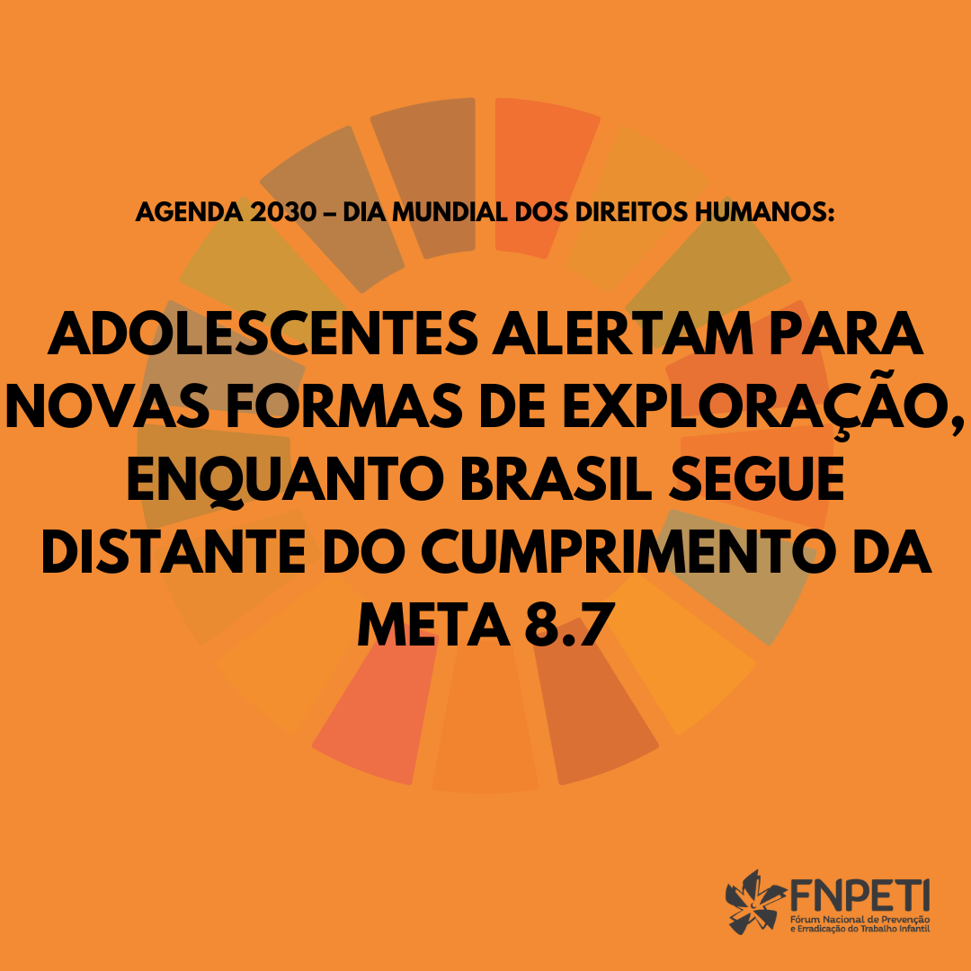 No Dia Mundial dos Direitos Humanos, celebrado em 10 de dezembro, o FNPETI reforça o alerta para o agravamento das violações contra crianças e adolescentes no Brasil — especialmente diante do avanço das modalidades digitais de exploração — ao mesmo tempo em que o país se mantém distante do cumprimento da meta 8.7 do ODS 8 da Agenda 2030, que exige a erradicação do trabalho infantil em todas as suas formas até 2025.