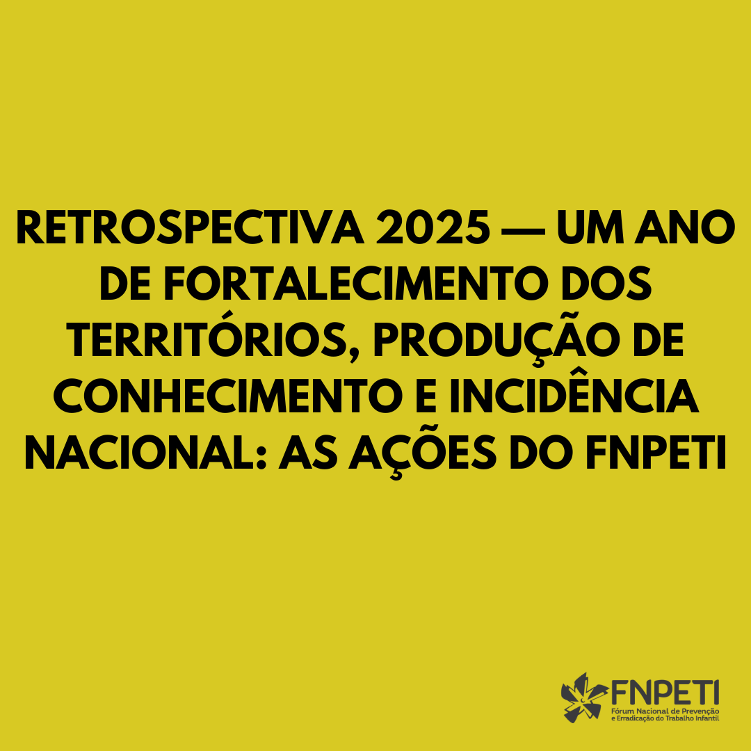 Mais do que uma retrospectiva, 2025 reitera o compromisso contínuo do FNPETI: estar presente nos territórios, apoiar tecnicamente, articular politicamente e produzir conhecimento que fortaleça o enfrentamento ao trabalho infantil em todo o Brasil. O Fórum segue atuando para que cada criança e adolescente viva plenamente sua infância, com direitos garantidos e livre de qualquer forma de exploração.
